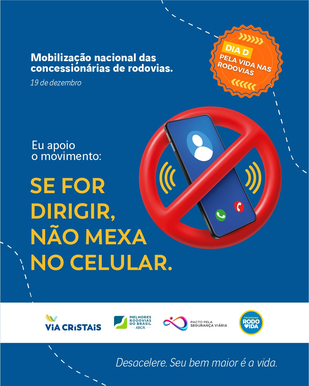 “A gente sabe que o celular faz parte da rotina, mas, ao volante, ele vira um risco. Queremos que esse alerta alcance as pessoas. Se for dirigir, não use o celular. É simples, é direto e salva vidas. Ao ampliar a divulgação do Dia D Pela Vida, reforçamos o compromisso da Via Cristais com um trânsito mais seguro, consciente e livre de distrações causadas pelo uso do celular ao volante” comenta Fabiano Xavier, gerente de Operações.